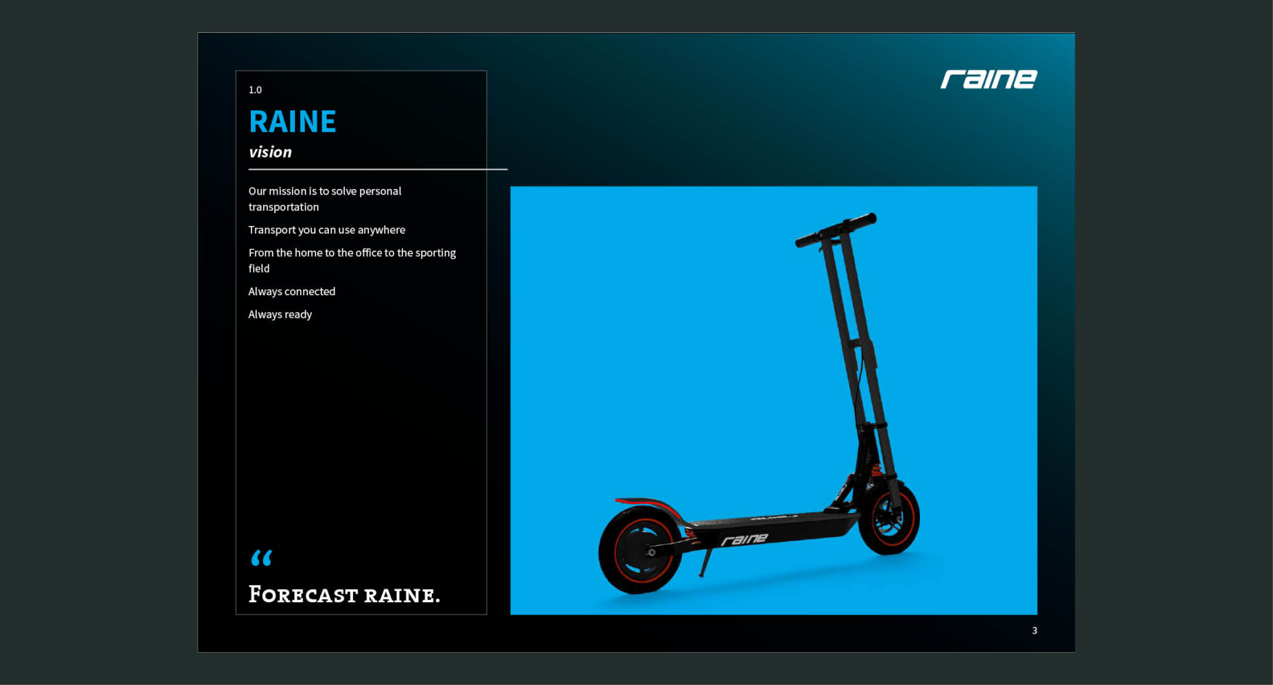 I developed the branding guidelines for Raine, a Melbourne-based electric scooter brand at an early stage of its business development. The project focused on defining a clear, contemporary visual identity that could support a future-facing mobility brand across digital, marketing, and product-related applications.